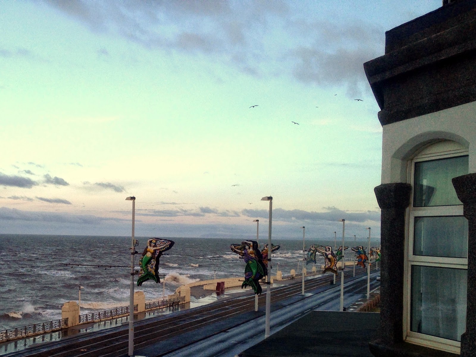hotel. The wind whipped the car door from my grasp and the air from my lungs.The gale shrieked through the tram wires and the giant plastic lamp post mermaids: Oh silent sirens of the raging deep. We fought the Atlantic blast to the front revolving door and spun into the foyer like circus clowns fired from a cannon. All was calm. A lovely smiley lass issued drinks. We were safe at last.