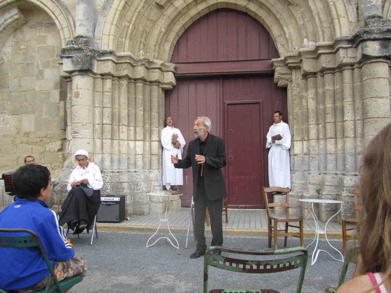 Highlight of my evening yesterday was a street theatre performance by M. Gonzales and other acteurs from le Treteau Savinois. To be honest I was not expecting too much. A few folding chairs had been placed before the church. We chatted to neighbours and all of a sudden a lady of the Revolution appeared, knitting and all. Now, may I just say that any kind of anything involving a something of the Revolution plunges me into T. Rex like a submarine spotting a destroyer….. you can’t fool the children of the Revolution can you now ? So – the lady explains that this is the story of the local priest of St. Savinien who was approached by the captains of the Revolution to become bishop of the whole area. As far as I could gather he wasn’t very religious and that is why they chose him. His sermons concerned le peuple and La France. Sadly, churchy type folks got rid of him and he lived out his days in a kinda gluttonous limbo. Now in England they would have made him Archbishop at least. The performance had genuine gravitas and humour and would not have disgraced any stage. My thanks to all concerned, particularly the dear young kids who were sent round with the hat afterwards……Added value methinks!