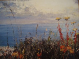 I know that I overwork the word JOY. The reason is simple. In the universe of our hearts there is so much of it and yet we allow ourselves so little. Just now and then life gives you a booster jab of joy. Today, the joy was not my own – but danced and flung itself in ecstasy from the canvases of an artist. When Gilles spotted a sign advertising an exhibition outside a house as he was driving home I expected a polite amateur show of “local” art. We wandered along this afternoon to take a look at the paintings of Sara Barnes. Let me say simply that it is a long time since I desperately wanted to write a poem. The picture below speaks so vibrantly of the defiant fragility of blooms against the sky, the hidden force of their roots feeding their cry of mortal beauty into the deaf indifference of the ocean.